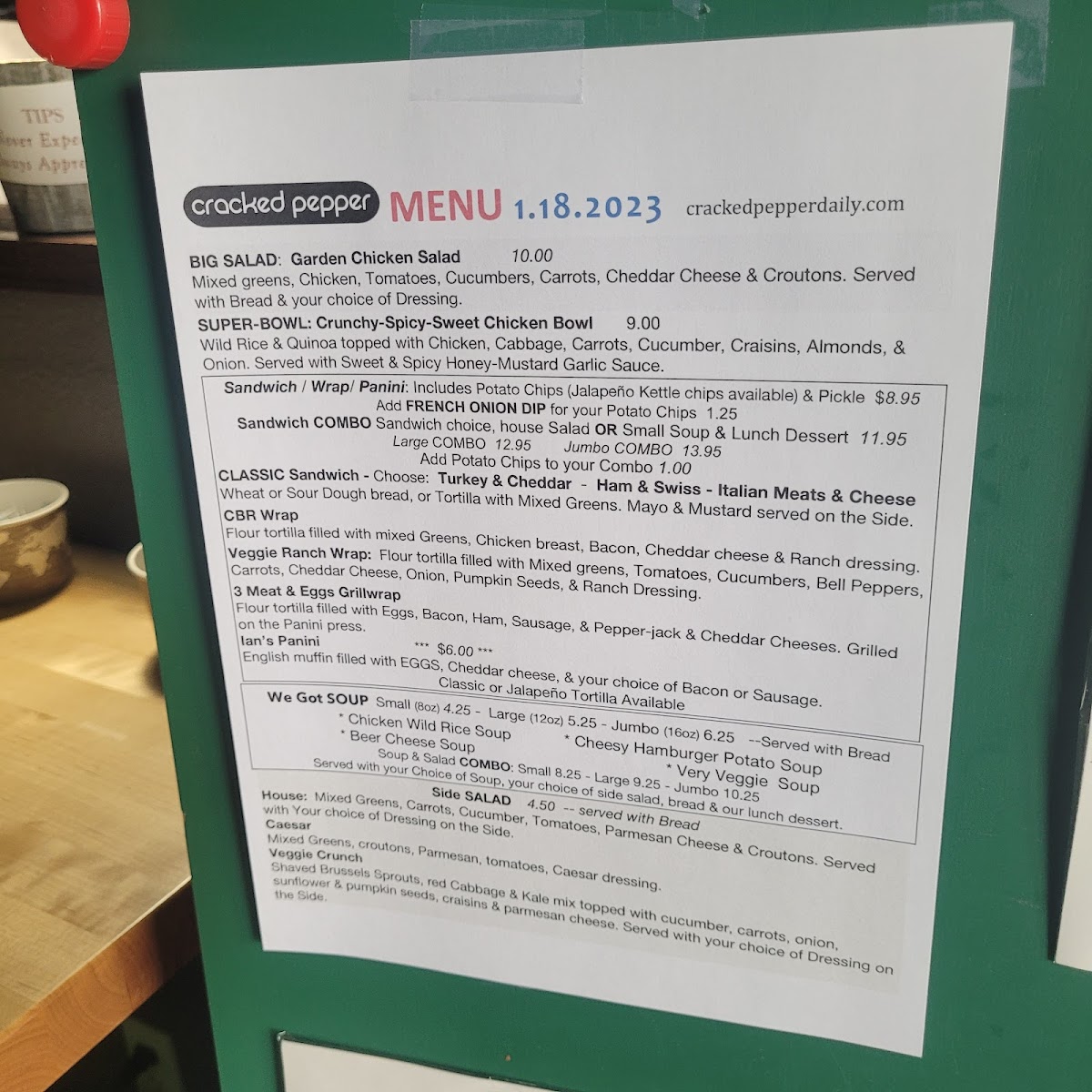 The menu at Cracked Pepper offers a delightful variety of comfort foods with a unique twist. For those craving a hearty start, the soups are a must-try, featuring the rich and creamy Chicken Wild Rice Soup, the savory Cheesy Hamburger Potato Soup, and the flavorful Beer Cheese Soup. Moving on to lighter options, their wraps and paninis are equally enticing, such as the delicious CBR Wrap, packed with grilled chicken, bacon, and ranch, and the fresh Veggie Ranch Wrap for a satisfying vegetarian option. The 3 Meat & Eggs Grillwrap is perfect for meat lovers, combining three types of meat with eggs in a warm, grilled wrap. For a more substantial bite, the Lan's Panini offers a grilled, toasty experience that pairs well with any soup. Whether you're in the mood for a comforting bowl of soup or a flavorful wrap, Cracked Pepper’s menu provides something for everyone, all served with warmth and quality.